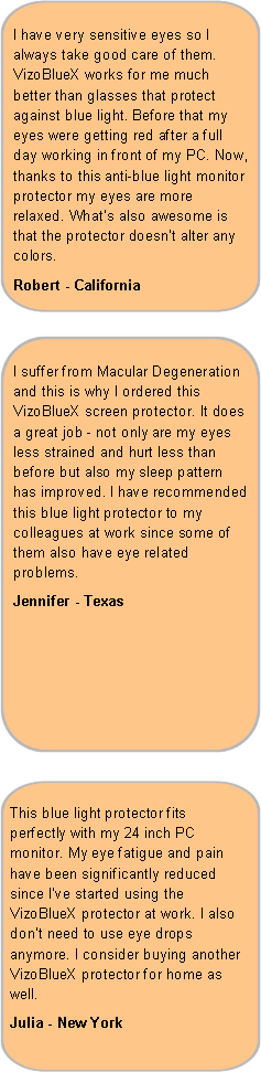 Advantages: · Best Blue-Light optical grade protection. Prevents Damage, Scratches and finger prints. A must have for families with children · Heavy Duty - Protects your TV / Display investment from Damage and improves sleeping patterns · Blocks harmful Blue light between 480nm~390nm and provides 100% UV protection · Prevents eye strain, CVS, chronic injuries to the eyes, eye fatigue, soreness and more serious eye related conditions · Prevent damage scratches and fingerprints to your display · 100% Multi-Layer protection - Elimination of Hazardous UV spectrum and Blocking Harmful HEV light VizoBlueX anti-blue light TV screen protector is tested to eliminate 100% of the UV light; up to 99.6% of the most harmful High Energy Blue light (390 to 420nm) and 60% from the entire HRV spectrum between 480nm~390nm. · 5 minutes Installation (Manual included) When you are exposed to too much blue light from your TV screen or computer monitor this leads to imbalanced melatonin levels which trigger sleep disorders, eye strain and fatigue. |