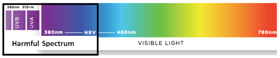 Humans see light spectrum from 380 to 780nm. UV (100-380nm) and Blue light (480~390nm) are generated by the screens of all electronic devices and can cause chronic injuries to the eyes, eye fatigue, soreness and more serious eye related conditions.